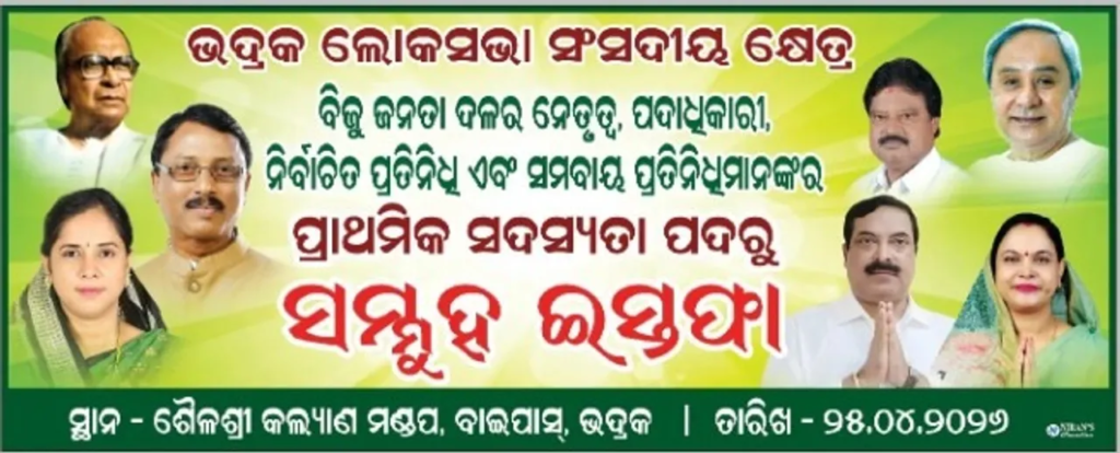 ଓଡ଼ିଶା ରାଜନୀତିରେ ଏକ ବଡ଼ ଧରଣର ଓଲଟପାଲଟ ଦେଖିବାକୁ ମିଳିଛି। ବିଶେଷ କରି ଉତ୍ତର ଓଡ଼ିଶାରେ ବିଜୁ ଜନତା ଦଳର ଗଡ଼ ଦୋହଲିବାରେ ଲାଗିଛି। ବାଲେଶ୍ୱର ପରେ ଏବେ ଭଦ୍ରକ ଜିଲ୍ଲାରେ ଦଳୀୟ ସଂଗଠନ ବିପର୍ଯ୍ୟୟର ସମ୍ମୁଖୀନ ହୋଇଛି। ଆଜି ଭଦ୍ରକ ଜିଲ୍ଲାର ଅନେକ ପ୍ରଭାବଶାଳୀ ନେତା ଓ ଶତାଧିକ କର୍ମୀ ବିଧିବଦ୍ଧ ଭାବେ ଦଳ ଛାଡ଼ିବାକୁ ଯାଉଛନ୍ତି: ପୂର୍ବତନ ସାଂସଦ ମଞ୍ଜୁଲତା ମଣ୍ଡଳ ଓ ପୂର୍ବତନ ବିଧାୟକ ମୁକ୍ତିକାନ୍ତ ମଣ୍ଡଳ ବିଜେଡି ଛାଡ଼ି ବିଜେପିରେ ସାମିଲ ହେବେ।